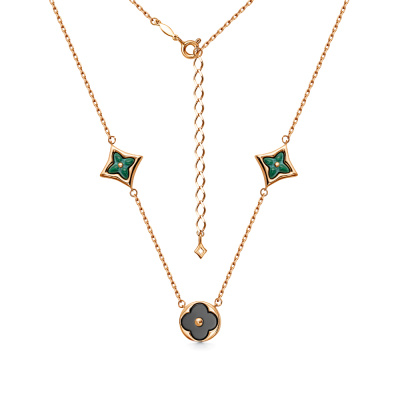 Шейное укр. с 1 ониксом черным природным, 1.535 карат; 2 малахитами синтетическими, 1.1 карат; Розовое золото 585 пробы.