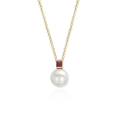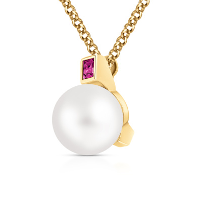 Шейное укр. с 1 рубином природным, 0.16 карат, цвет 2, чистота 2; 1 жемчугом пресноводным культивированным белым; Желтое золото 585 пробы.