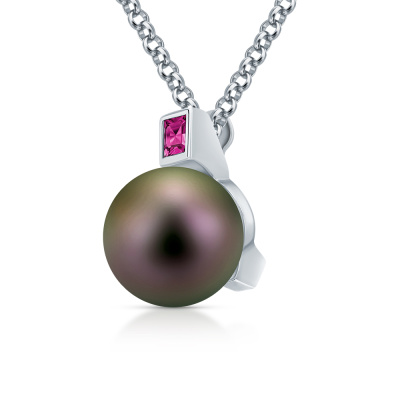 Шейное укр. с 1 рубином природным, 0.18 карат, цвет 2, чистота 2; 1 жемчугом морским культивированным черным; Белое золото 585 пробы.