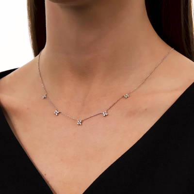 Шейное укр. с 20 бриллиантами природными, 0.39 карат, огранка круг 57 граней, цвет 4, чистота 6, тип огранки А; 5 бриллиантами природными, 0.03 карат, огранка круг 57 граней, цвет 3, чистота 6, тип огранки А; Белое золото 585 пробы.