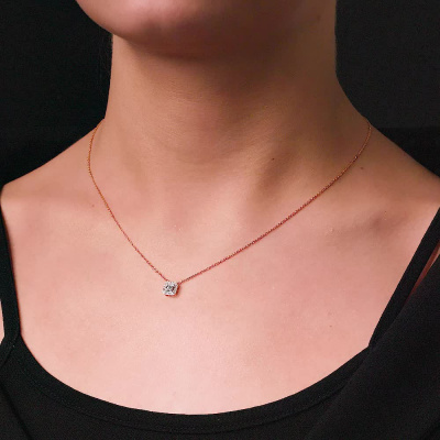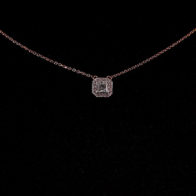 Шейное укр. с 1 бриллиантом природным, 0.23 карат, огранка принцесса 65 граней, цвет 3, чистота 6, тип огранки А; 16 бриллиантами природными, 0.06 карат, огранка круг 17 граней, цвет 2, чистота 2, тип огранки А; Розовое золото 585 пробы.
