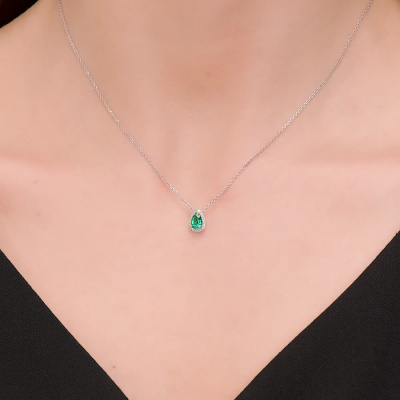 Шейное укр. с 22 бриллиантами природными, 0.04 карат, огранка круг 17 граней, цвет 2, чистота 2, тип огранки А; 1 изумрудом выращенным Колумбия, 0.38 карат; Белое золото 585 пробы.