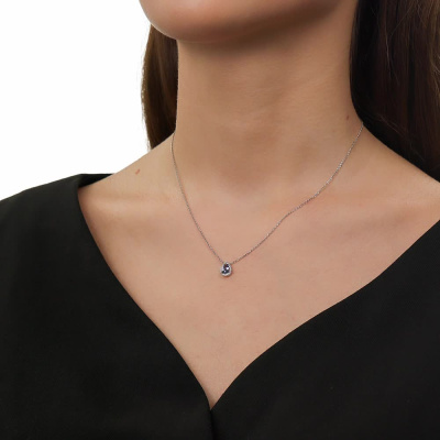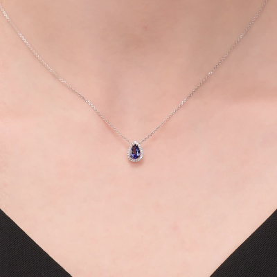 Шейное укр. с 22 бриллиантами природными, 0.04 карат, огранка круг 17 граней, цвет 2, чистота 2, тип огранки А; 1 сапфиром синт. Чохр., 0.52 карат; Белое золото 585 пробы.