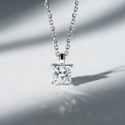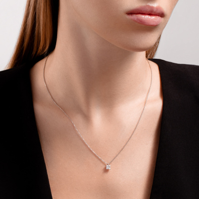 Колье с 1 бриллиантом природным, 0.41 карат, огранка принцесса 65 граней, цвет 4, чистота 6, тип огранки А; Белое золото 585 пробы.