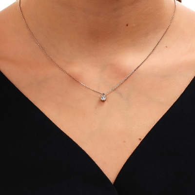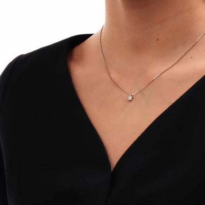 Колье с 1 бриллиантом, 0.417 карат, огранка принцесса 65 граней, цвет 4, чистота 6, тип огранки А; 1 бриллиантом, 0.417 карат, огранка принцесса 65 граней, цвет 4, чистота 6, тип огранки А; 1 бриллиантом, 0.417 карат, огранка принцесса 65 граней, цвет 4, чистота 6, тип огранки А; Белое золото 585 пробы.