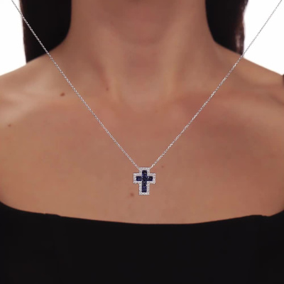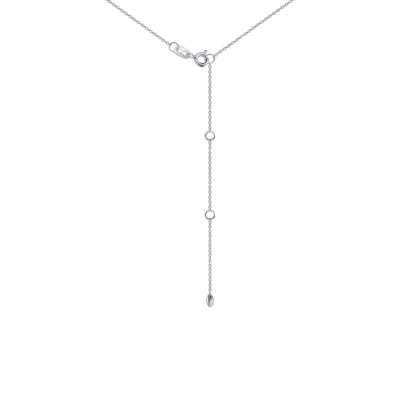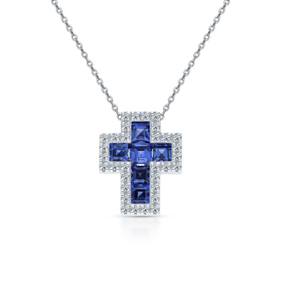 Шейное укр. с 1 сапфиром выращенным, 0.28 карат; 5 сапфирами выращенными, 0.85 карат; 32 бриллиантами выращенными, 0.19 карат, огранка круг 57 граней, цвет 3, чистота 6, тип огранки А; Белое золото 585 пробы.