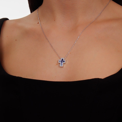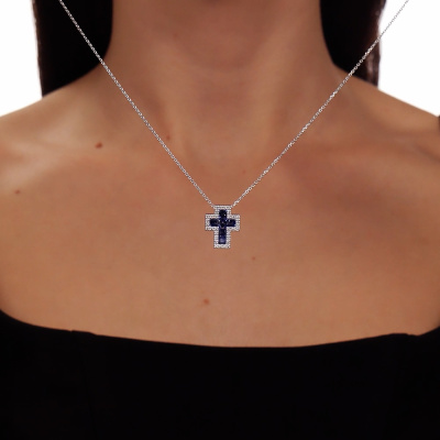 Шейное укр. с 1 сапфиром выращенным, 0.282 карат, тип огранки Б; 5 сапфирами выращенными, 0.825 карат, тип огранки Б; 32 бриллиантами выращенными, 0.197 карат, огранка круг 57 граней, цвет 3, чистота 6, тип огранки А; Белое золото 585 пробы.