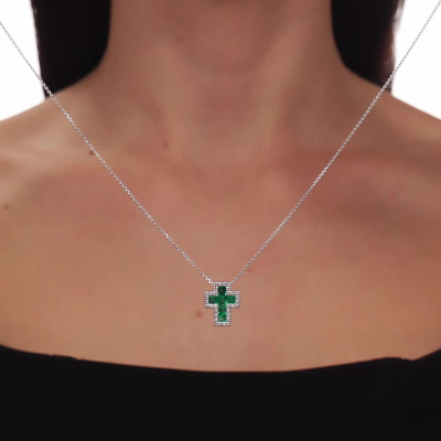 Шейное укр. с 1 изумрудом выращенным Колумбия, 0.18 карат; 5 изумрудами выращенными Колумбия, 0.51 карат; 32 бриллиантами выращенными, 0.19 карат, огранка круг 57 граней, цвет 3, чистота 5, тип огранки А; Белое золото 585 пробы.