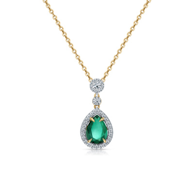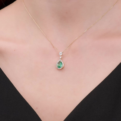Шейное укр. с 1 бриллиантом природным, 0.05 карат, огранка круг 57 граней, цвет 3, чистота 6, тип огранки А; 1 бриллиантом природным, 0.01 карат, огранка круг 57 граней, цвет 3, чистота 6, тип огранки А; 24 бриллиантами природными, 0.11 карат, огранка круг 17 граней, цвет 2, чистота 2, тип огранки А; 9 бриллиантами природными, 0.03 карат, огранка круг 17 граней, цвет 2, чистота 2, тип огранки А; 1 изумрудом природным, 0.92 карат, цвет 3, чистота 3, тип огранки Б; Желтое золото 585 пробы.