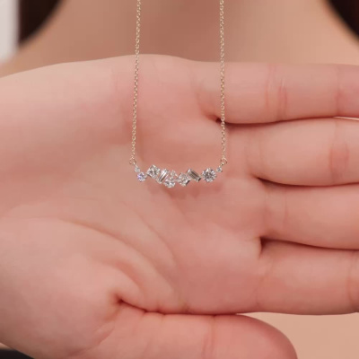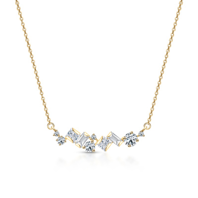 Шейное укр. с 1 бриллиантом выращенным, 0.19 карат, огранка круг 57 граней, цвет 3, чистота 6, тип огранки А; 2 бриллиантами выращенными, 0.34 карат, огранка принцесса 65 граней, цвет 3, чистота 6, тип огранки А; 2 бриллиантами выращенными, 0.22 карат, огранка багет 33 грани, цвет 3, чистота 6, тип огранки А; 1 бриллиантом выращенным, 0.09 карат, огранка круг 57 граней, цвет 3, чистота 6, тип огранки А; 1 бриллиантом выращенным, 0.04 карат, огранка круг 57 граней, цвет 3, чистота 6, тип огранки А; 3 бриллиантами выращенными, 0.03 карат, огранка круг 57 граней, цвет 3, чистота 6, тип огранки А; Желтое золото 585 пробы.