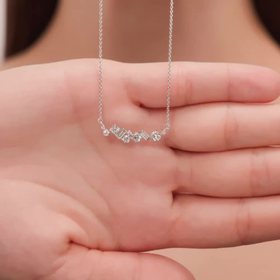 Шейное укр. с 1 бриллиантом выращенным, 0.19 карат, огранка круг 57 граней, цвет 3, чистота 6, тип огранки А; 2 бриллиантами выращенными, 0.36 карат, огранка принцесса 65 граней, цвет 3, чистота 6, тип огранки А; 2 бриллиантами выращенными, 0.22 карат, огранка багет 33 грани, цвет 3, чистота 6, тип огранки А; 1 бриллиантом выращенным, 0.09 карат, огранка круг 57 граней, цвет 3, чистота 6, тип огранки А; 1 бриллиантом выращенным, 0.04 карат, огранка круг 57 граней, цвет 3, чистота 6, тип огранки А; 3 бриллиантами выращенными, 0.03 карат, огранка круг 57 граней, цвет 3, чистота 6, тип огранки А; Белое золото 585 пробы.