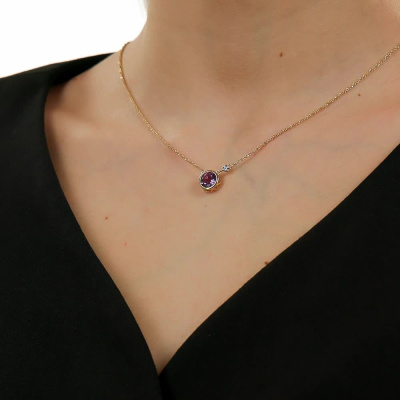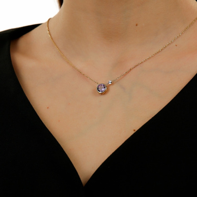 Колье с 1 бриллиантом природным, 0.005 карат, огранка круг 17 граней, цвет 2, чистота 2, тип огранки А; 1 аметистом природным, 1.77 карат; Желтое и белое золото 585 пробы.