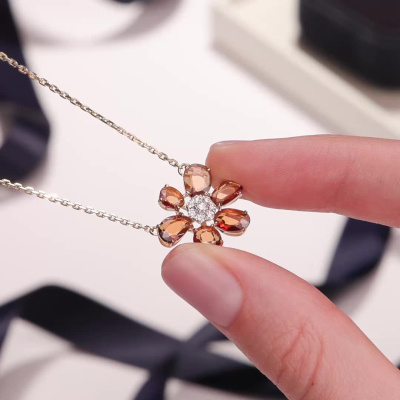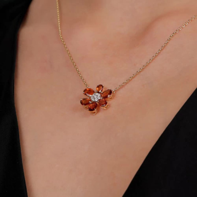 Шейное укр. с 1 бриллиантом природным, 0.027 карат, огранка круг 57 граней, цвет 3, чистота 5, тип огранки А; 7 бриллиантами природными, 0.108 карат, огранка круг 57 граней, цвет 3, чистота 5, тип огранки А; 6 гранатами спессартинами природными, тип огранки Б; Желтое золото 585 пробы.