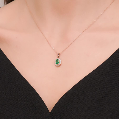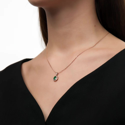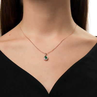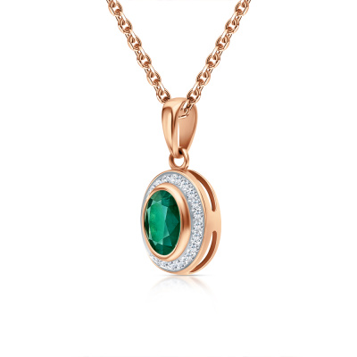 Подвеска с 22 бриллиантами природными, 0.09 карат, огранка круг 17 граней, цвет 2, чистота 2, тип огранки А; 1 изумрудом природным, 0.68 карат, цвет 3, чистота 3, тип огранки Б; Розовое золото 585 пробы.