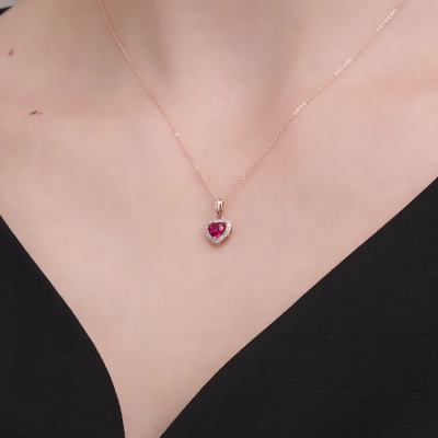 Подвеска с 17 бриллиантами природными, 0.07 карат, огранка круг 17 граней, цвет 2, чистота 2, тип огранки А; 1 рубином синтетическим, 0.56 карат; Розовое золото 585 пробы.