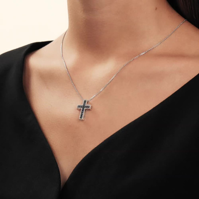 Подвеска с 60 бриллиантами природными, 0.11 карат, огранка круг 17 граней, цвет 2, чистота 2, тип огранки Б; 15 сапфирами природными, 0.29 карат, цвет 2, чистота 2, тип огранки В; Белое золото 585 пробы.