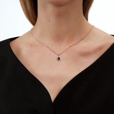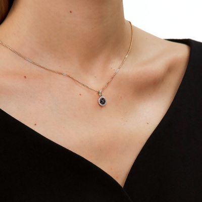 Подвеска с 22 бриллиантами природными, 0.05 карат, огранка круг 17 граней, цвет 2, чистота 3, тип огранки Б; 4 бриллиантами черными природными облагороженными, 0.3 карат, огранка круг 57 граней, цвет 7, чистота 6, тип огранки А; Желтое золото 585 пробы.
