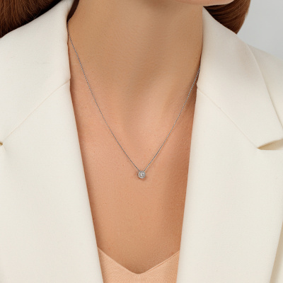 Подвеска с 1 бриллиантом природным, 0.1 карат, огранка круг 57 граней, цвет 3, чистота 5, тип огранки А; 11 бриллиантами природными, 0.04 карат, огранка круг 17 граней, цвет 2, чистота 2, тип огранки А; Белое золото 585 пробы.