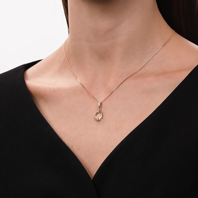 Подвеска с 3 бриллиантами природными, 0.006 карат, огранка круг 17 граней, цвет 2, чистота 2, тип огранки А; 3 бриллиантами природными, 0.005 карат, огранка круг 17 граней, цвет 2, чистота 2, тип огранки А; 1 празиолитом природным, 2.6 карат; Розовое золото 585 пробы.