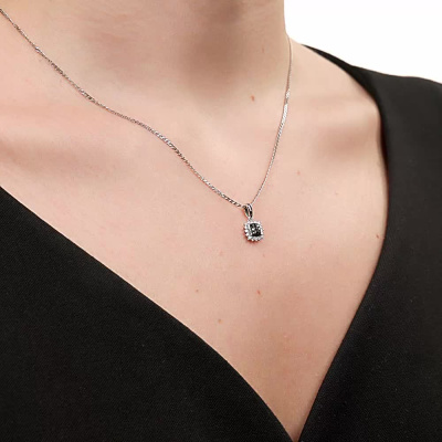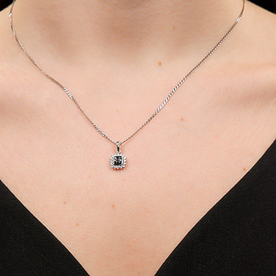 Подвеска с 16 бриллиантами природными, 0.1 карат, огранка круг 57 граней, цвет 4, чистота 6; 9 бриллиантами черными природными облагороженными, 0.09 карат, огранка круг 57 граней, цвет 7, чистота 6, тип огранки А; Белое золото 585 пробы.