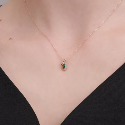 Подвеска с 6 бриллиантами природными, 0.02 карат, огранка круг 17 граней, цвет 2, чистота 2, тип огранки Б; 1 бриллиантом природным, 0.003 карат, огранка круг 17 граней, цвет 2, чистота 2, тип огранки Б; 1 гидротермальным изумрудом, 0.11 карат; Розовое золото 585 пробы.