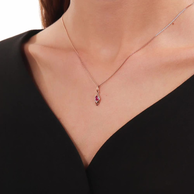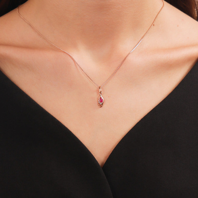Подвеска с 3 бриллиантами природными, 0.008 карат, огранка круг 17 граней, цвет 2, чистота 2, тип огранки А; 1 рубином синтетическим, 0.14 карат; Розовое золото 585 пробы.