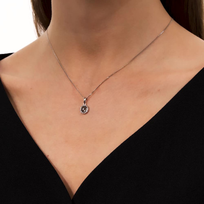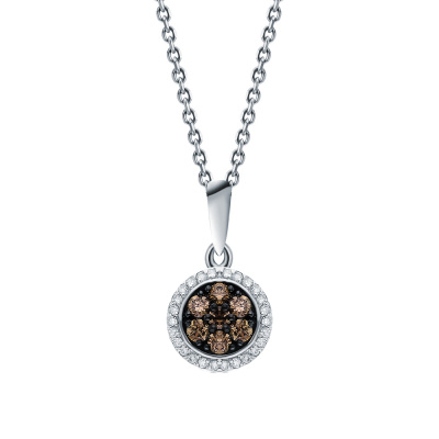 Подвеска с 26 бриллиантами природными, 0.05 карат, огранка круг 17 граней, цвет 2, чистота 2, тип огранки А; 7 бриллиантами коньячными природными, 0.14 карат, огранка круг 57 граней, цвет 7, чистота 5, тип огранки А; Белое золото 585 пробы.