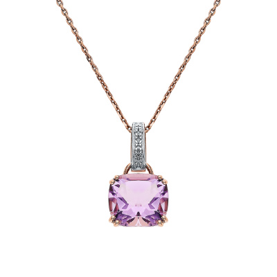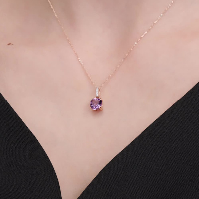 Подвеска с 6 бриллиантами природными, 0.01 карат, огранка круг 17 граней, цвет 2, чистота 2, тип огранки А; 1 аметистом природным, 1.88 карат; Розовое золото 585 пробы.