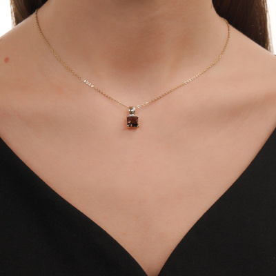 Подвеска с 4 бриллиантами природными, 0.01 карат, огранка круг 17 граней, цвет 2, чистота 2, тип огранки Б; 1 кварцем дымчатым природным, 1.54 карат; Желтое золото 585 пробы.