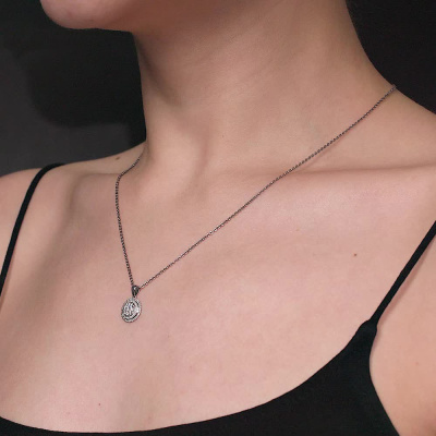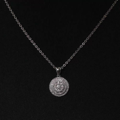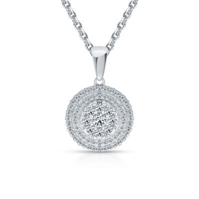 Подвеска с 1 бриллиантом природным, 0.04 карат, огранка круг 57 граней, цвет 4, чистота 6, тип огранки А; 8 бриллиантами природными, 0.1 карат, огранка круг 57 граней, цвет 4, чистота 6, тип огранки А; 60 бриллиантами природными, 0.1 карат, огранка круг 17 граней, цвет 2, чистота 3, тип огранки Б; Белое золото 585 пробы.