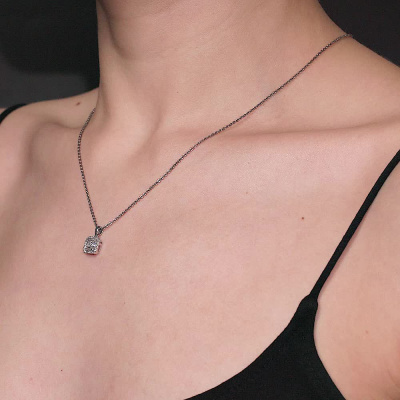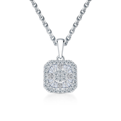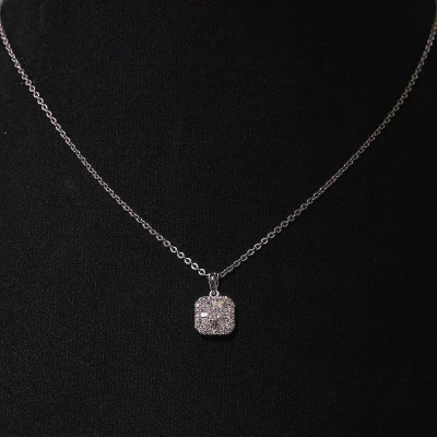 Подвеска с 16 бриллиантами природными, 0.18 карат, огранка багет 25 граней, цвет 3, чистота 6, тип огранки А; 31 бриллиантом природным, 0.12 карат, огранка круг 17 граней, цвет 2, чистота 3, тип огранки Б; Белое золото 585 пробы.