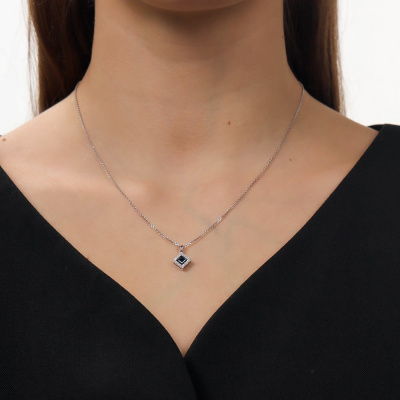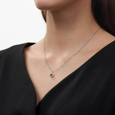 Подвеска с 20 бриллиантами природными, 0.09 карат, огранка круг 17 граней, цвет 2, чистота 3; 1 сапфиром природным, 0.61 карат, цвет 3, чистота 4, тип огранки Б; Белое золото 585 пробы.