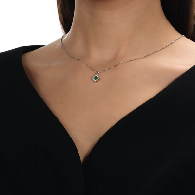 Подвеска с 20 бриллиантами природными, 0.09 карат, огранка круг 17 граней, цвет 2, чистота 3, тип огранки Б; 1 изумрудом природным, 0.49 карат, цвет 4, чистота 3, тип огранки Б; Белое золото 585 пробы.
