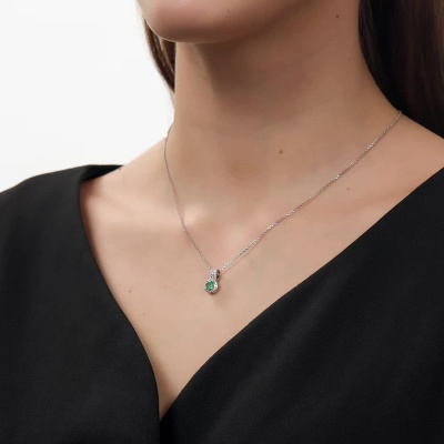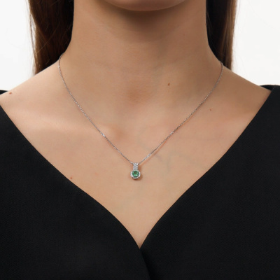 Подвеска с 33 бриллиантами природными, 0.12 карат, огранка круг 17 граней, цвет 2, чистота 3; 1 изумрудом природным, 0.45 карат, цвет 3, чистота 3; Белое золото 585 пробы.