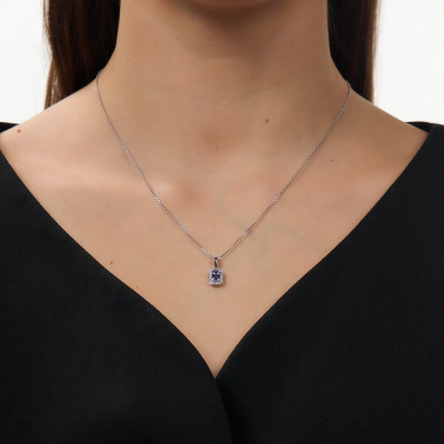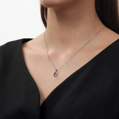 Подвеска с 18 бриллиантами природными, 0.12 карат, огранка круг 17 граней, цвет 2, чистота 3; 1 танзанитом природным, 0.54 карат; Белое золото 585 пробы.