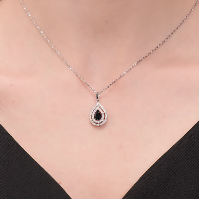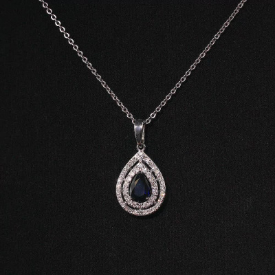 Подвеска с 15 бриллиантами природными, 0.13 карат, огранка круг 17 граней, цвет 2, чистота 2, тип огранки А; 3 бриллиантами природными, 0.02 карат, огранка круг 17 граней, цвет 2, чистота 2, тип огранки А; 32 бриллиантами природными, 0.15 карат, огранка круг 17 граней, цвет 2, чистота 2, тип огранки А; 1 сапфиром природным, 0.8 карат, цвет 2, чистота 2, тип огранки Б; Белое золото 585 пробы.