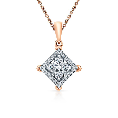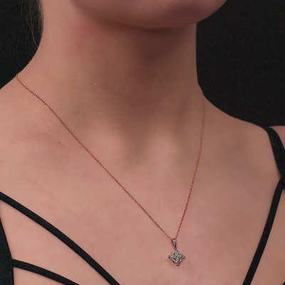 Подвеска с 4 бриллиантами природными, 0.15 карат, огранка круг 57 граней, цвет 3, чистота 6, тип огранки А; 24 бриллиантами природными, 0.08 карат, огранка круг 17 граней, цвет 2, чистота 2, тип огранки А; Розовое и белое золото 585 пробы.