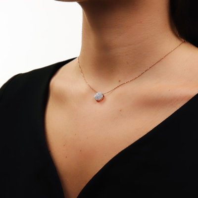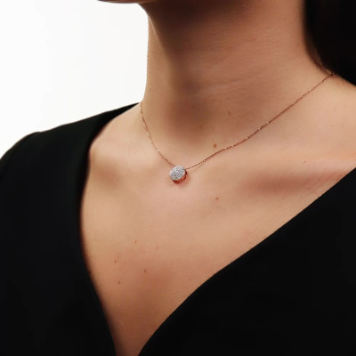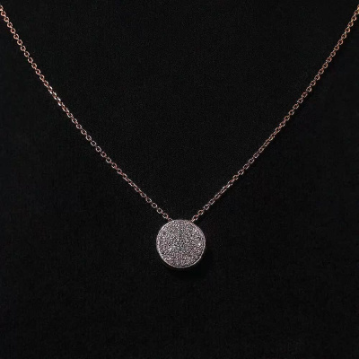 Подвеска с 61 бриллиантом природным, 0.16 карат, огранка круг 17 граней, цвет 2, чистота 2, тип огранки А; Розовое золото 585 пробы.