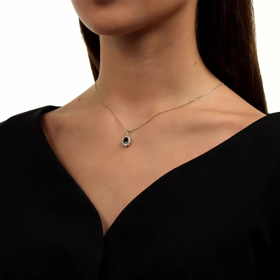 Подвеска с 10 бриллиантами природными, 0.36 карат, огранка круг 57 граней, цвет 3, чистота 6, тип огранки А; 1 сапфиром природным, 0.95 карат, цвет 2, чистота 2, тип огранки Б; Белое золото 585 пробы.