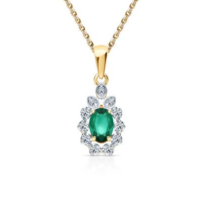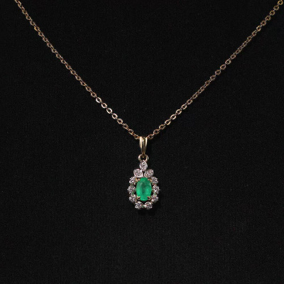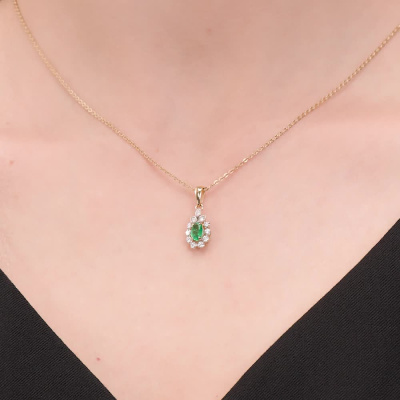 Подвеска с 8 бриллиантами природными, 0.11 карат, огранка круг 57 граней, цвет 3, чистота 6, тип огранки А; 3 бриллиантами природными, 0.02 карат, огранка круг 57 граней, цвет 3, чистота 6, тип огранки А; 1 изумрудом природным, 0.42 карат, цвет 3, чистота 3, тип огранки Б; Желтое золото 585 пробы.