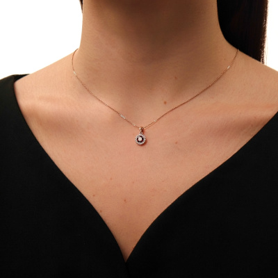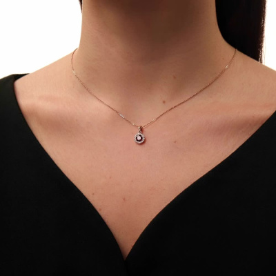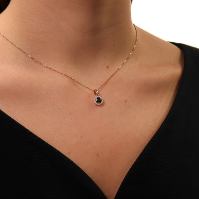Подвеска с 17 бриллиантами природными, 0.07 карат, огранка круг 17 граней, цвет 2, чистота 2, тип огранки А; 1 гранатом природным, 0.6 карат; Розовое золото 585 пробы.