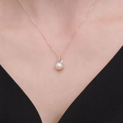 Подвеска с 9 бриллиантами природными, 0.01 карат, огранка круг 17 граней, цвет 2, чистота 2, тип огранки А; 1 жемчугом пресноводным культивированным белым; Розовое золото 585 пробы.