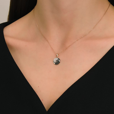 Подвеска с 32 бриллиантами природными, 0.07 карат, огранка круг 17 граней, цвет 2, чистота 2, тип огранки А; 32 бриллиантами черными природными облагороженными, 0.08 карат, огранка круг 57 граней, цвет 7, чистота 6, тип огранки А; Розовое золото 585 пробы.
