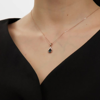 Подвеска с 7 бриллиантами природными, 0.02 карат, огранка круг 17 граней, цвет 2, чистота 2, тип огранки А; 1 топазом лондон природным, 0.71 карат; Розовое золото 585 пробы.