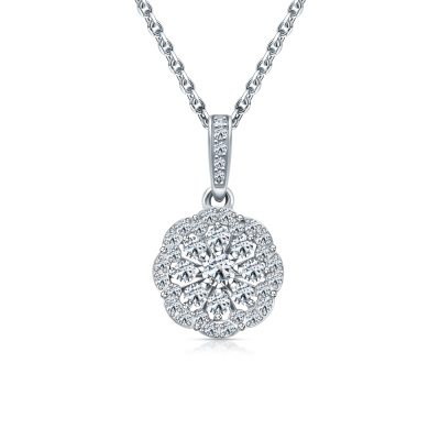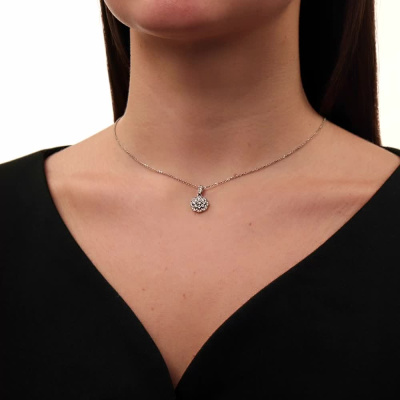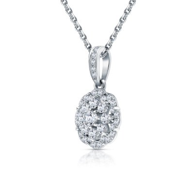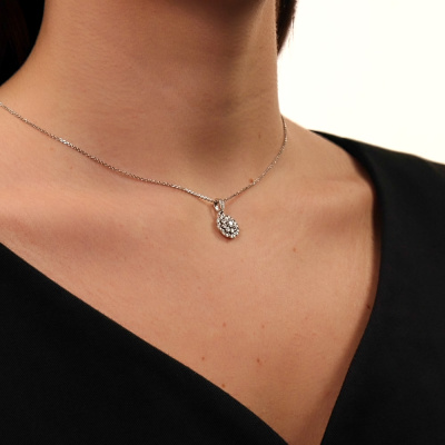 Подвеска с 1 бриллиантом природным, 0.09 карат, огранка круг 57 граней, цвет 3, чистота 6, тип огранки А; 8 бриллиантами природными, 0.23 карат, огранка круг 57 граней, цвет 3, чистота 6, тип огранки А; 27 бриллиантами природными, 0.2 карат, огранка круг 57 граней, цвет 3, чистота 6, тип огранки А; 2 бриллиантами природными, 0.008 карат, огранка круг 17 граней, цвет 2, чистота 2, тип огранки А; Белое золото 585 пробы.