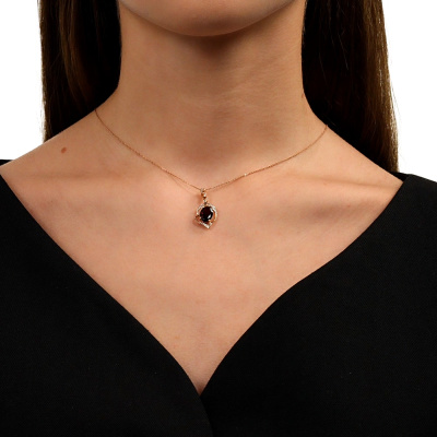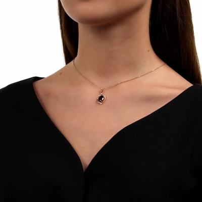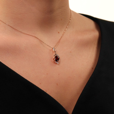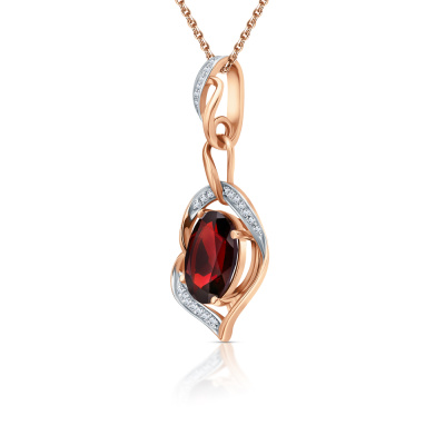 Подвеска с 24 бриллиантами природными, 0.04 карат, огранка круг 17 граней, цвет 2, чистота 2, тип огранки А; 1 гранатом природным, 2.05 карат; Розовое золото 585 пробы.