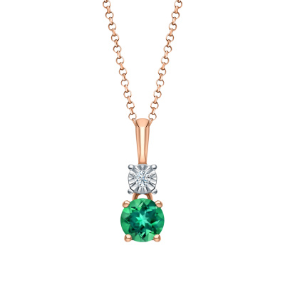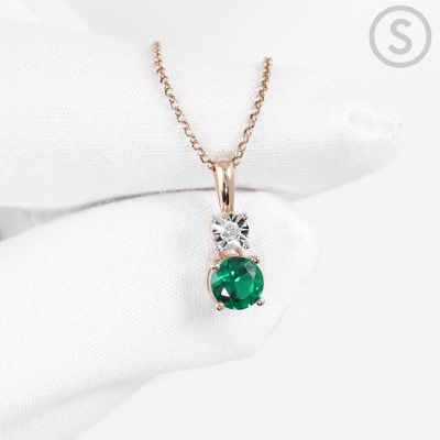 Подвеска с 1 бриллиантом природным, 0.02 карат, огранка круг 57 граней, цвет 3, чистота 6, тип огранки А; 1 гидротермальным изумрудом, 0.38 карат; Розовое и белое золото 585 пробы.