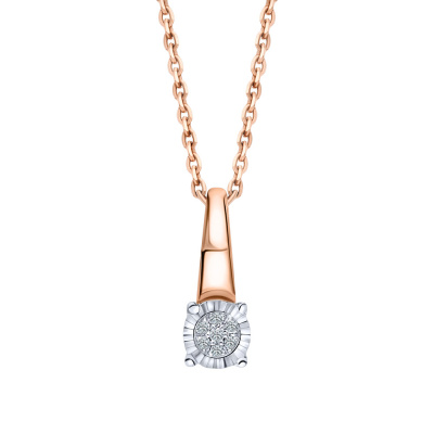 Подвеска с 1 бриллиантом природным, 0.005 карат, огранка круг 17 граней, цвет 2, чистота 2, тип огранки А; 6 бриллиантами природными, 0.01 карат, огранка круг 17 граней, цвет 2, чистота 2, тип огранки А; Розовое и белое золото 585 пробы.