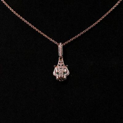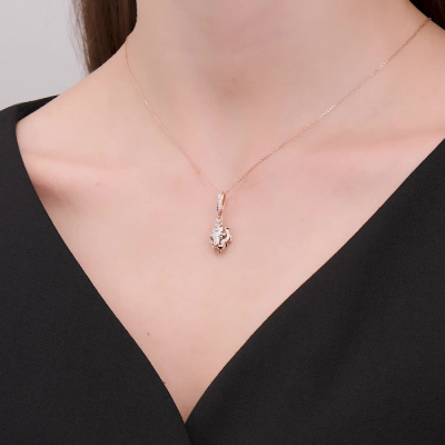 Подвеска с 58 бриллиантами природными, 0.14 карат, огранка круг 17 граней, цвет 2, чистота 2, тип огранки А; 2 изумрудами природными, 0.008 карат, цвет 3, чистота 3, тип огранки В; Розовое золото 585 пробы.