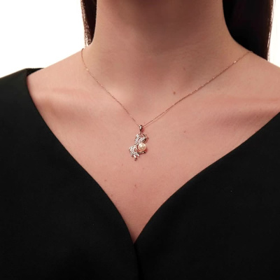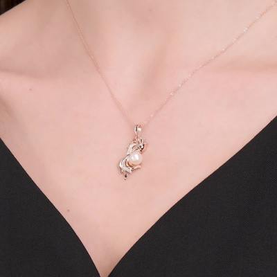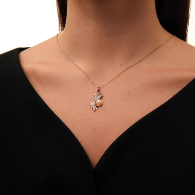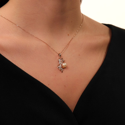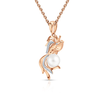 Подвеска с 5 бриллиантами природными, 0.02 карат, огранка круг 17 граней, цвет 2, чистота 2, тип огранки А; 12 бриллиантами природными, 0.02 карат, огранка круг 17 граней, цвет 2, чистота 2, тип огранки А; 1 жемчугом пресноводным культивированным белым; Розовое золото 585 пробы.